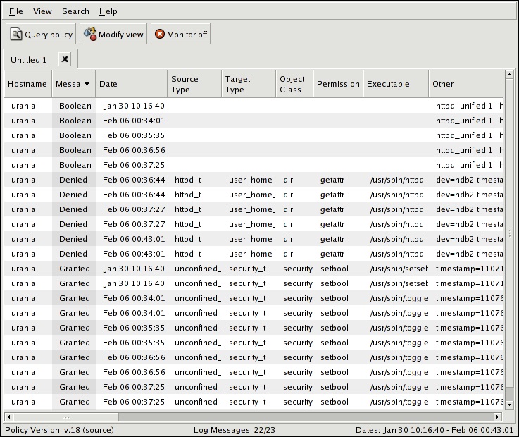shows seaudit displaying the audit log with several different kinds of messages displayed. The Other column is where the timestamp and serial number are displayed.