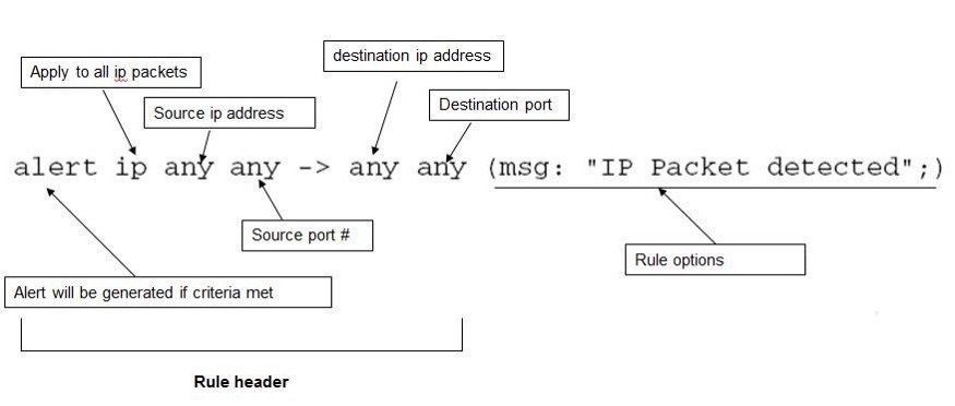 The rule action tells Snort what to do when it finds a packet that matches the rule criteria (usually alert).